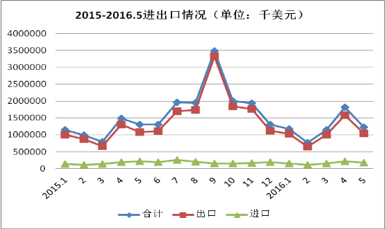 圖1 2015年1月-2016年5月外貿(mào)進(jìn)出口總額走勢(shì)