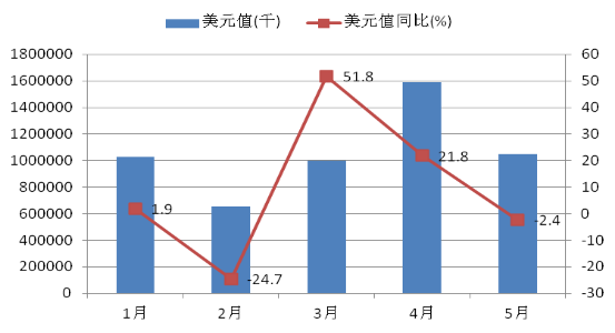 據(jù)海關(guān)初步統(tǒng)計(jì),1-5月,全國(guó)進(jìn)出口總值9.16萬(wàn)億元,同比(下同)下降3.2%。按美元計(jì), 1-5月,全國(guó)進(jìn)出口總值1.41萬(wàn)億美元,同比下降8.6%。5月當(dāng)月,全國(guó)進(jìn)出口總值2.02萬(wàn)億元,增長(zhǎng)2.8%。其中,出口1.17萬(wàn)億元,增長(zhǎng)1.2%;進(jìn)口0.85萬(wàn)億元,增長(zhǎng)5.1%;順差3248億元,下降7.7%。按美元計(jì),5月當(dāng)月,全國(guó)進(jìn)出口總值3121億美元,下降2.6%。1-5月外貿(mào)運(yùn)行主要呈以下特點(diǎn):一是出口保持小幅增長(zhǎng),進(jìn)口實(shí)現(xiàn)正增長(zhǎng)。二是對(duì)主要經(jīng)濟(jì)體出口回落,對(duì)巴西和澳大利亞進(jìn)口增長(zhǎng)加快。三是一般貿(mào)易占比有所提升,其他貿(mào)易較快增長(zhǎng)。四是勞動(dòng)密集型產(chǎn)品出口好于機(jī)電產(chǎn)品,部分大宗商品進(jìn)口量升價(jià)跌。五是民營(yíng)企業(yè)對(duì)出口增量貢獻(xiàn)最大,國(guó)有企業(yè)進(jìn)口由降轉(zhuǎn)增。六是東中部地區(qū)進(jìn)出口好于全國(guó),西部地區(qū)進(jìn)口增長(zhǎng)較快[2]。