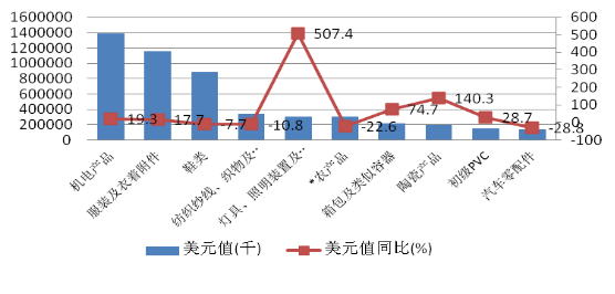 出口主要商品中,以機(jī)電產(chǎn)品、服裝、鞋類和燈具等傳統(tǒng)出口優(yōu)勢(shì)產(chǎn)品結(jié)束了2015年的下滑趨勢(shì),均出現(xiàn)不同程度回暖。按貿(mào)易額機(jī)電產(chǎn)品、鞋類、服裝、農(nóng)產(chǎn)品和紡織制品占據(jù)前5位,降幅最大的3種商品是服裝、箱包和PVC材料,出口量分別下降48.9%、52.0%和24.1%,出口額分別下降48%、46.5%和40.8%,體現(xiàn)為量?jī)r(jià)齊跌態(tài)勢(shì)。以高新技術(shù)產(chǎn)品、汽車零件等為代表的高附加值產(chǎn)品出口在持續(xù)多年的連續(xù)增長(zhǎng)后,自2015年起開始出現(xiàn)下滑(見圖6)。