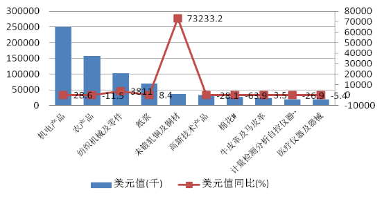 在鼓勵(lì)外資政策措施的引導(dǎo)下,我區(qū)外商投資企業(yè)和中外合作企業(yè)積極調(diào)整產(chǎn)品結(jié)構(gòu),努力拓展?fàn)I銷渠道,深度開發(fā)國(guó)際市場(chǎng),取得良好效果。同時(shí),作為新疆外貿(mào)主力軍的民營(yíng)企業(yè)進(jìn)出口仍占據(jù)主導(dǎo)地位。1-5月,呈現(xiàn)“國(guó)退民進(jìn)”態(tài)勢(shì),國(guó)有企業(yè)進(jìn)出口總額8.1億美元,同比下滑19.8%,民營(yíng)企業(yè)進(jìn)出口122.1億元,同比增長(zhǎng)13.7%,高于整體降幅6.9個(gè)百分點(diǎn),占進(jìn)出口總額的84.6%,(見圖9)。外資企業(yè)較有起色,其中,外商獨(dú)資企業(yè)進(jìn)出口40803美元,同比增長(zhǎng)12.8%。