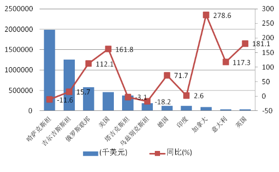 同時(shí),隨著出口企業(yè)深入推進(jìn)市場(chǎng)多元化,前5月,我區(qū)對(duì)美國(guó)、加拿大、德國(guó)、意大利、英國(guó)及俄羅斯等國(guó)貿(mào)易增長(zhǎng)可觀,貿(mào)易額分別為15.8、3.2、1.8和1.6億美元,分別增長(zhǎng)164.3%、30.5%、117.3%和70.7%。前10位貿(mào)易伙伴情況(見表1、圖8)。