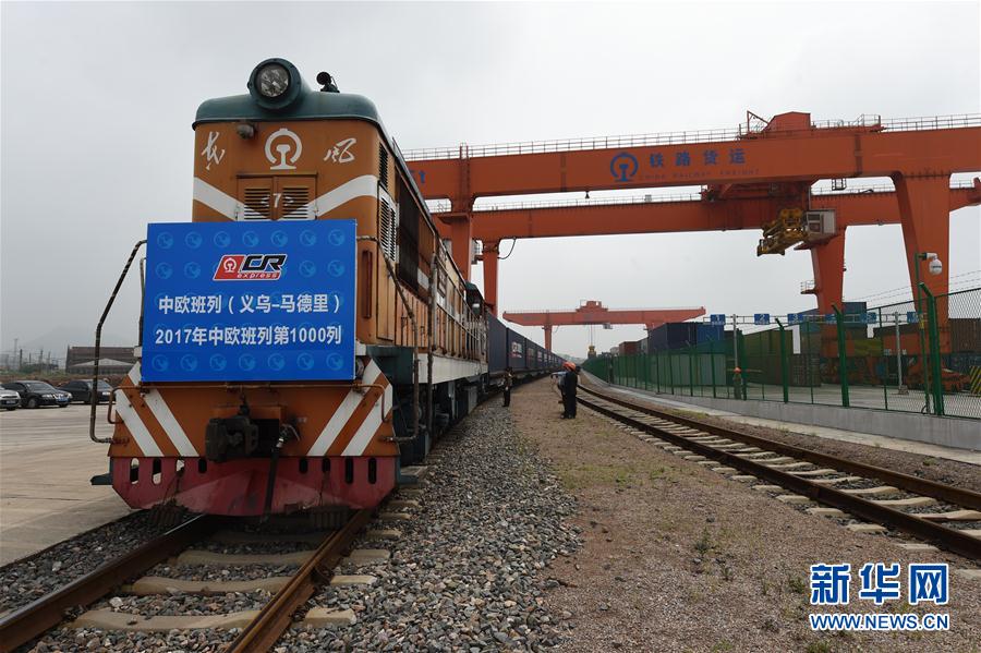 2017年5月13日,2017年第1000列中歐班列從義烏西站駛出。當(dāng)日,X8024次中歐班列(義烏-馬德里)從浙江義烏鐵路西站鳴笛駛出。這列滿載小商品、服裝等貨物的列車是2017年開行的第1000列中歐班列。中國鐵路總公司統(tǒng)計(jì)顯示,2017年中歐班列開行數(shù)量較去年同期增加612列,增長158%。