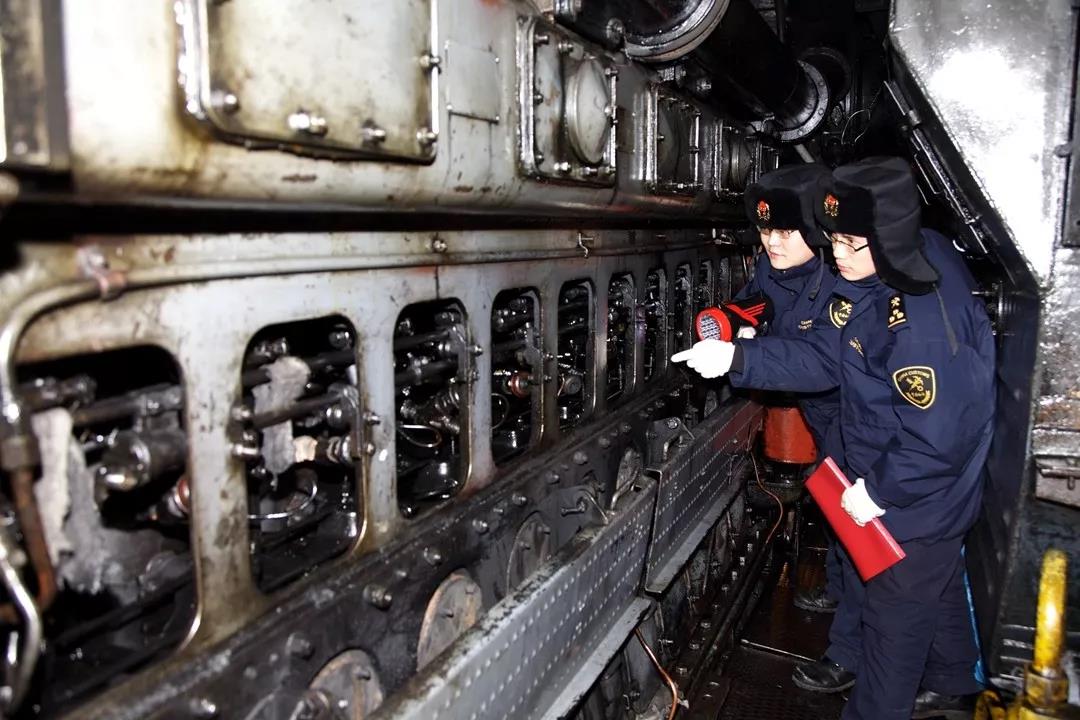海關(guān)工作人員正對中歐班列牽引機車(俗稱機頭)進行登臨檢查